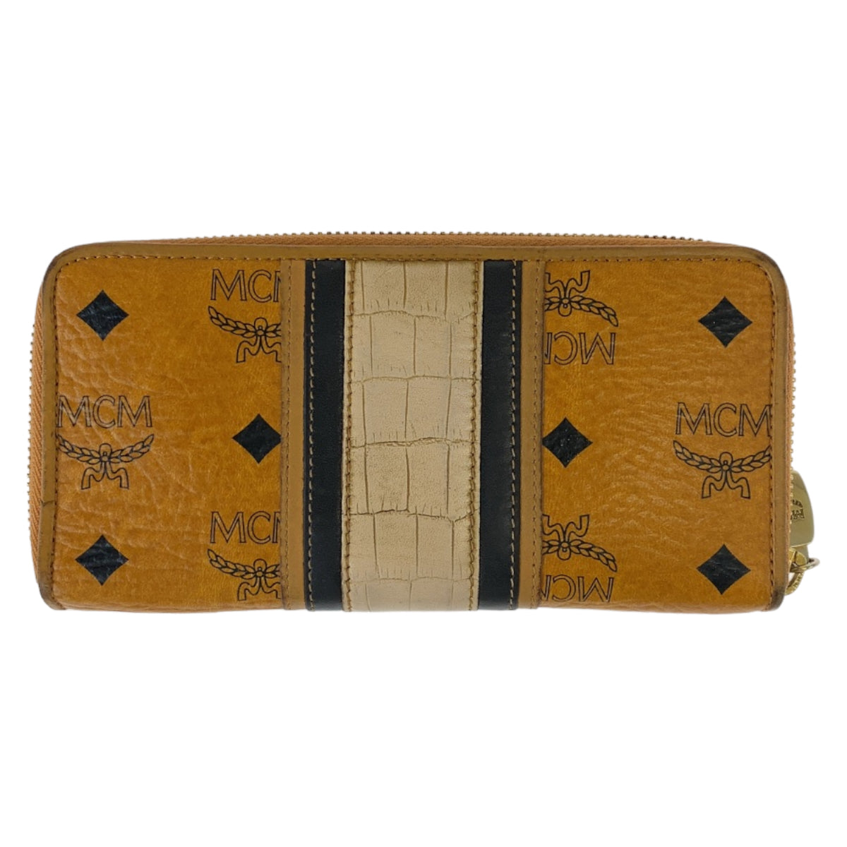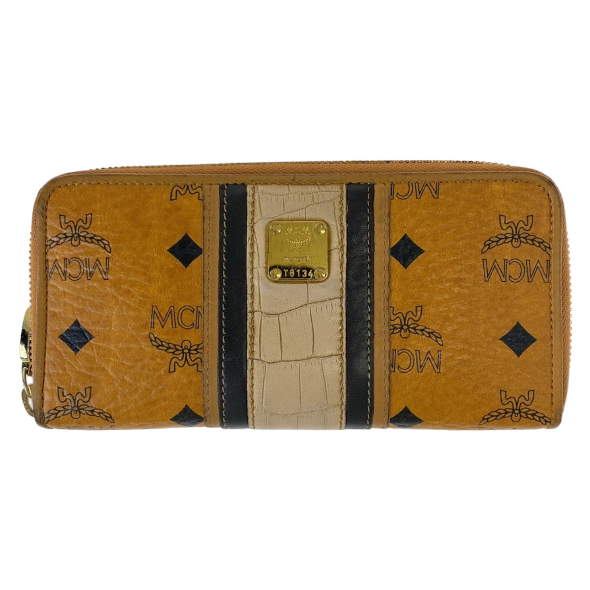MCM Visetos Light Brown Camel Gold Hardware Leather Long Wallet Round Zipper Unisex Men's