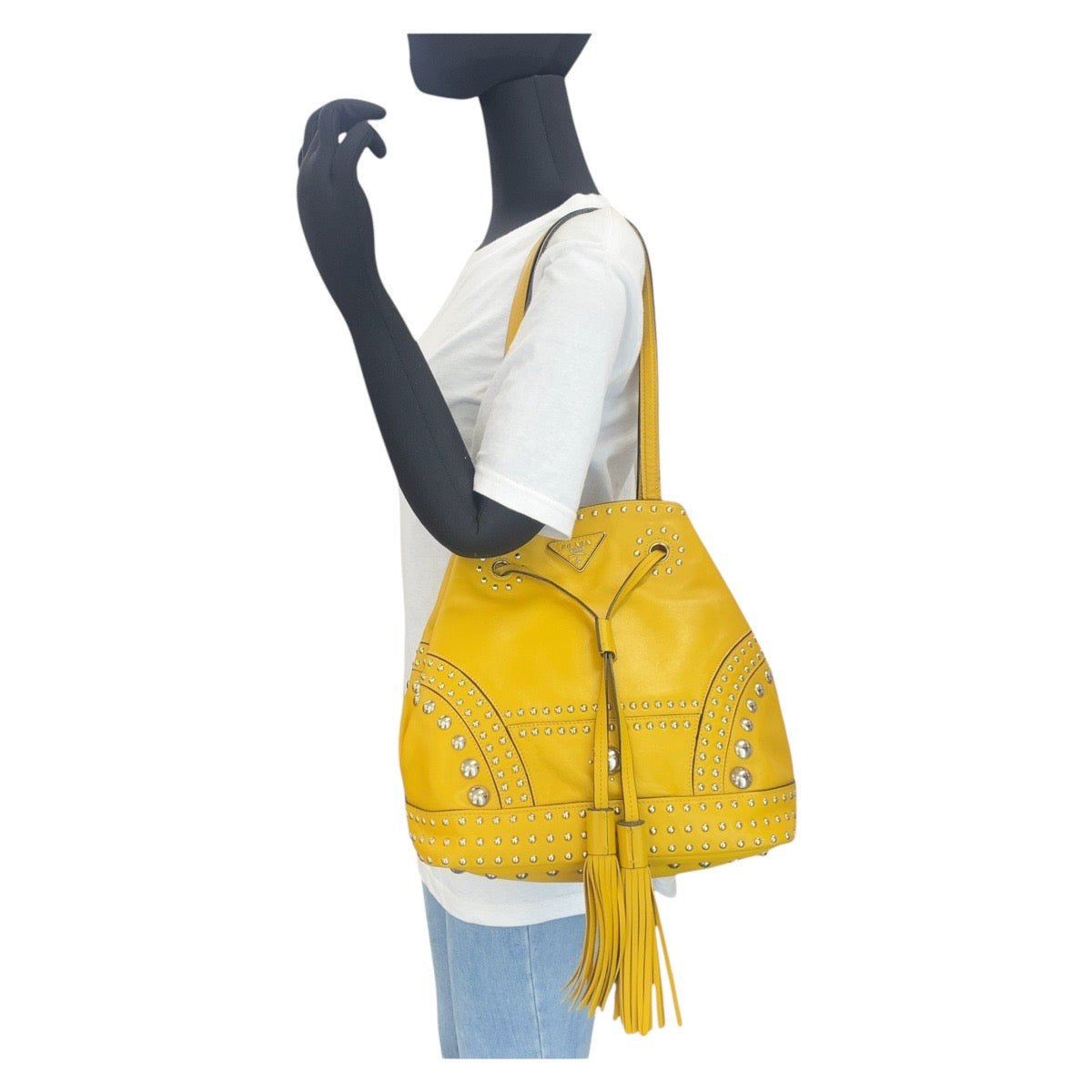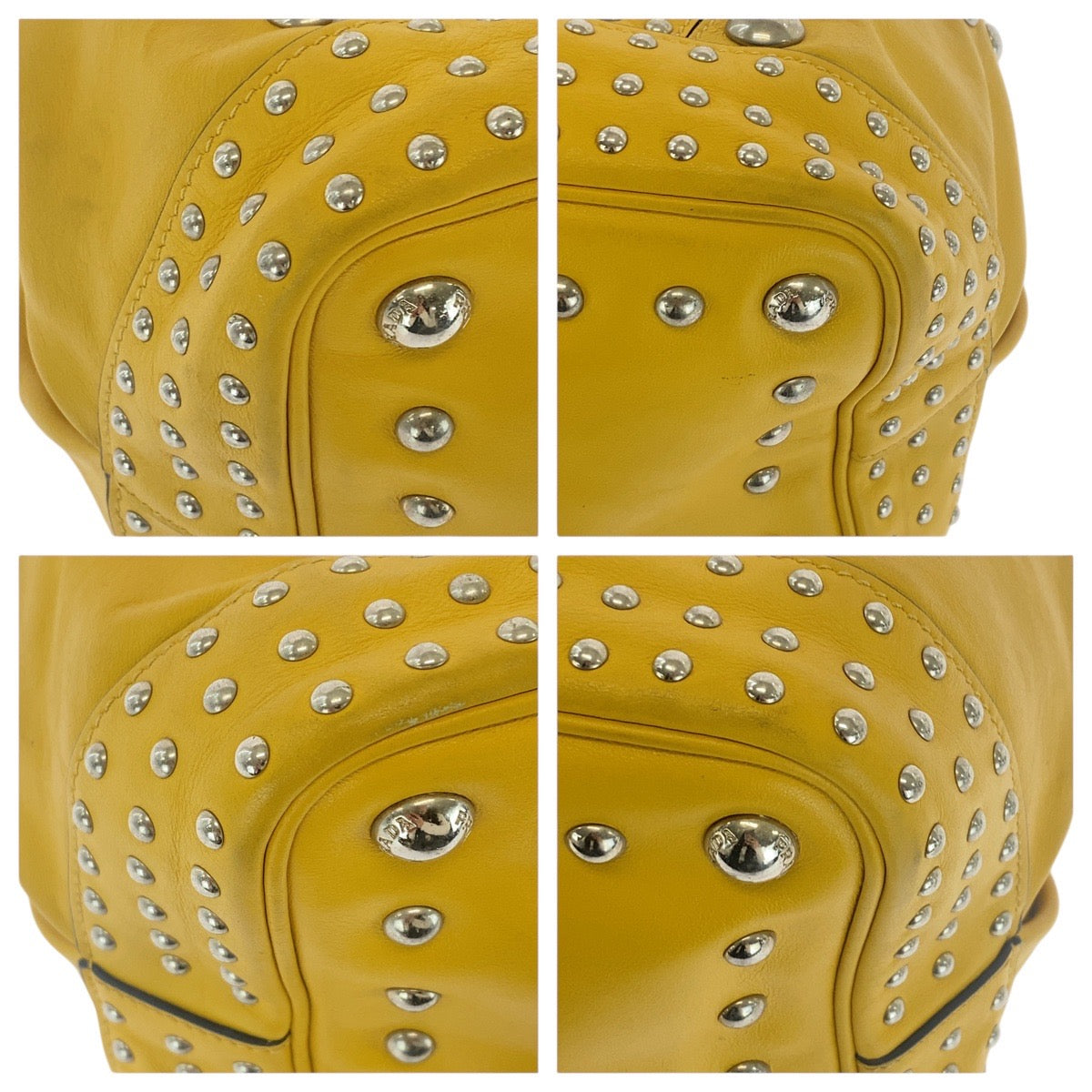 17037 PRADA プラダ 三角ロゴプレート イエロー シルバー金具 レザー ショルダーバッグ 巾着 タッセル スタッズ レディース AB78
