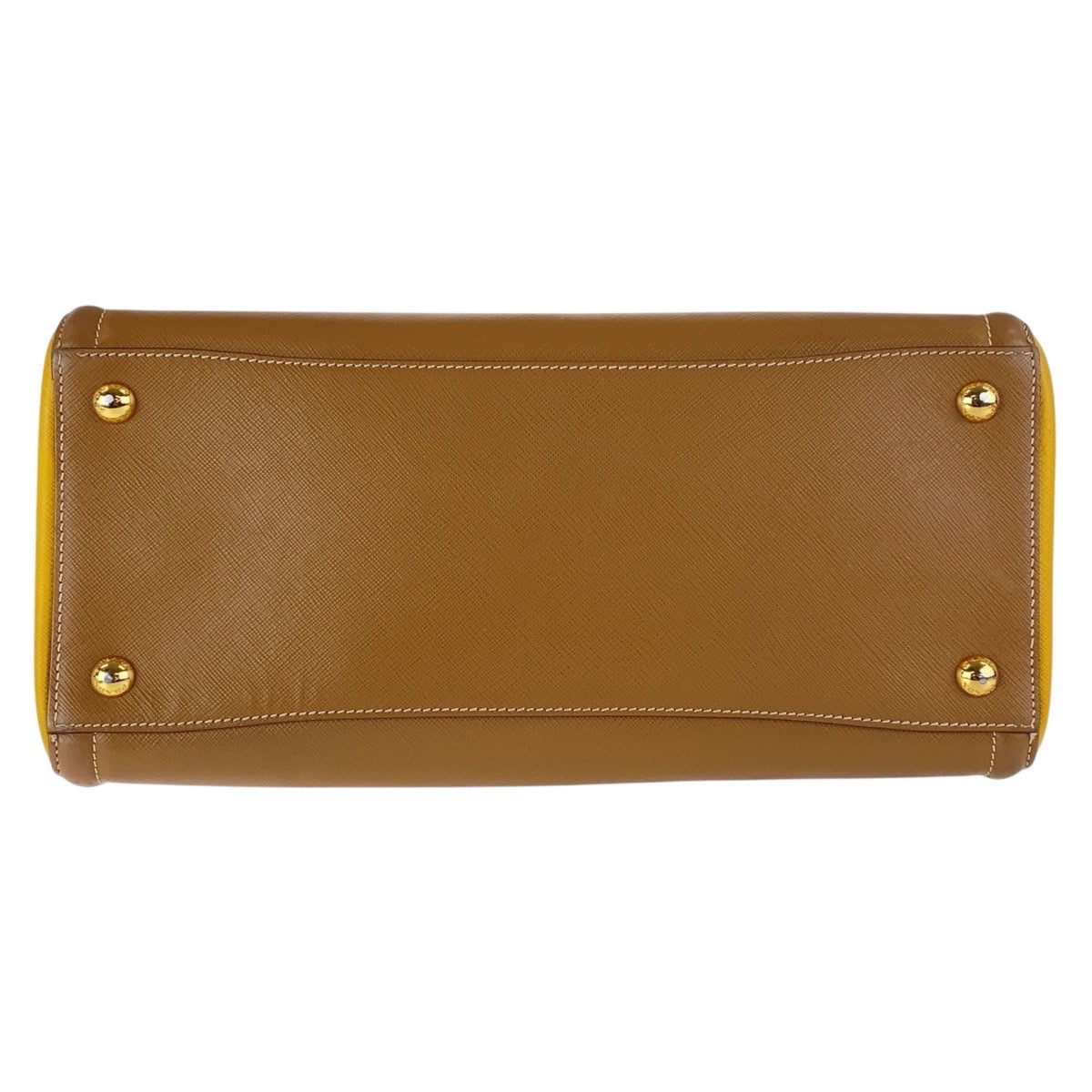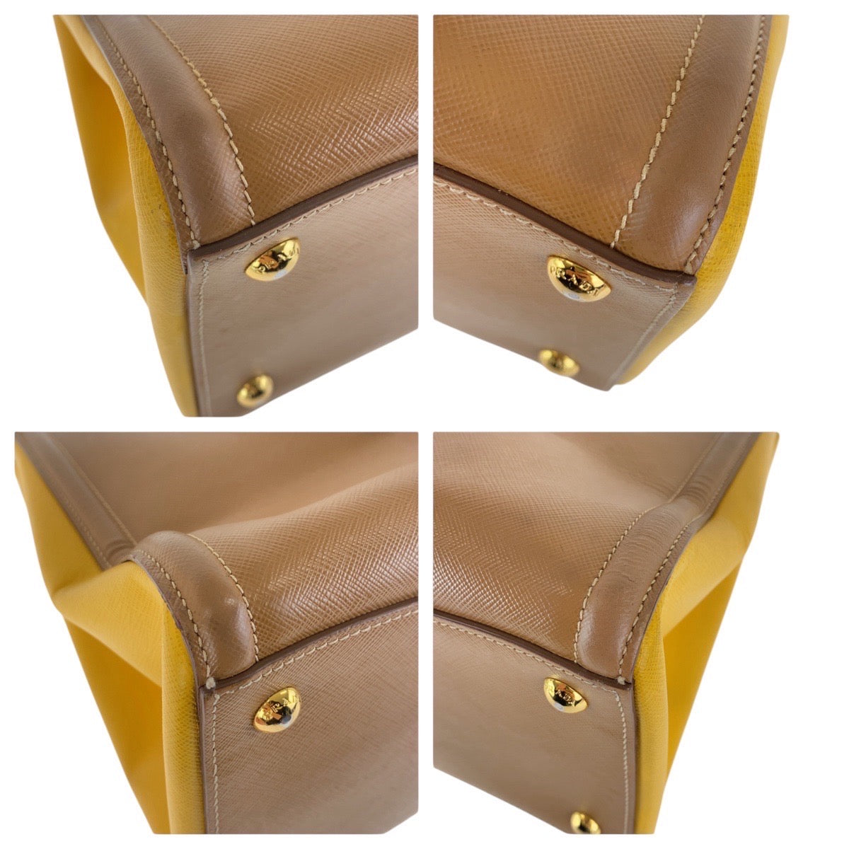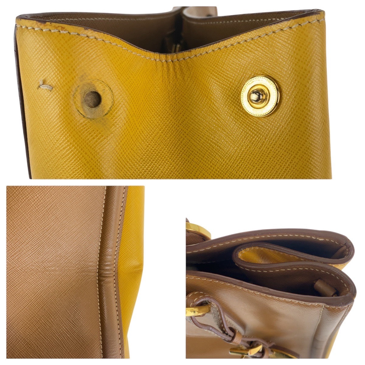17047 PRADA プラダ サフィアーノ 三角ロゴプレート バイカラー ブラウン イエロー ゴールド金具 レザー トートバッグ ショルダーバッグ 2WAY レディース AB78