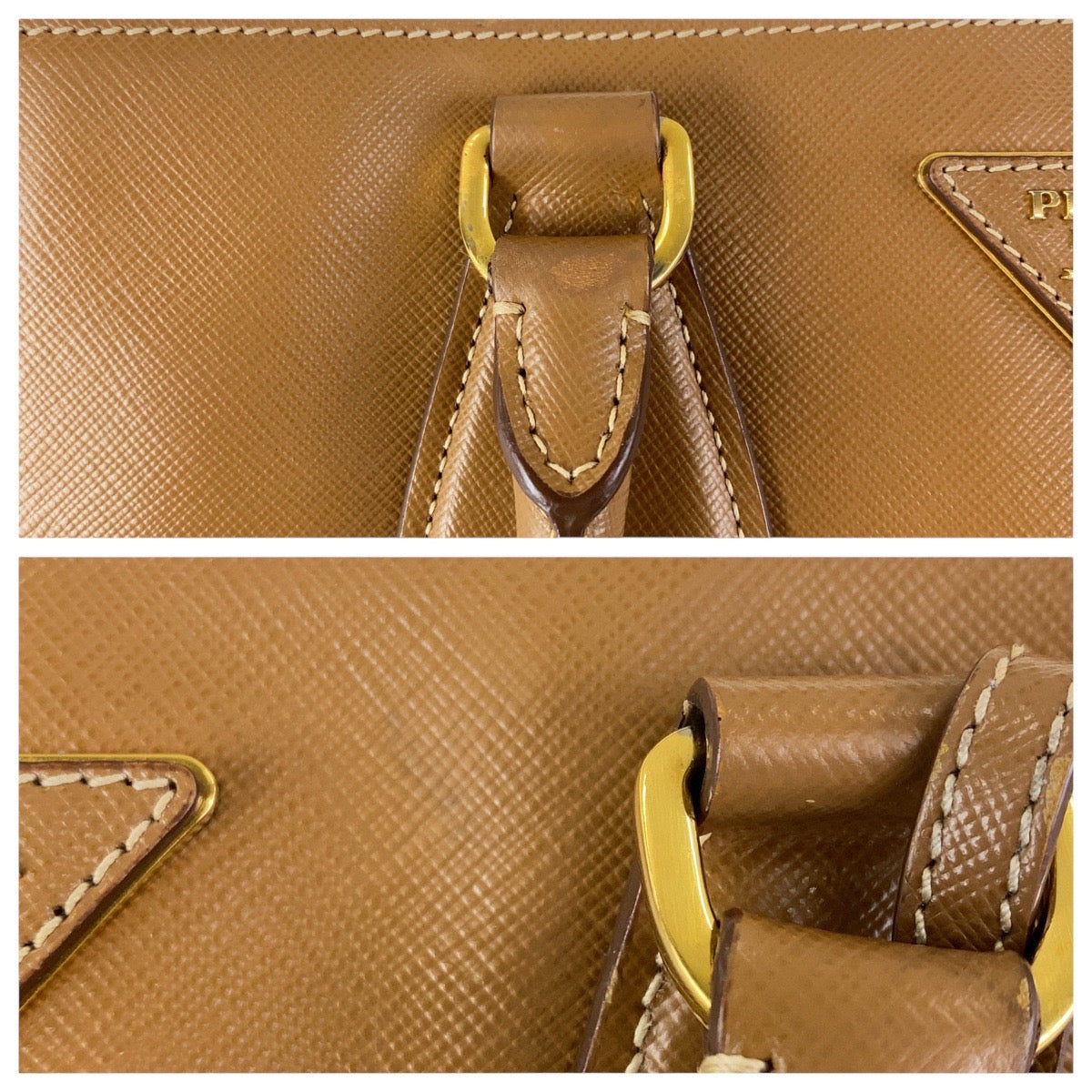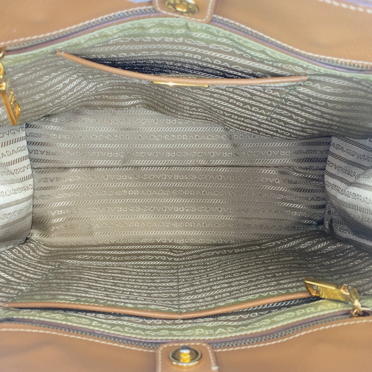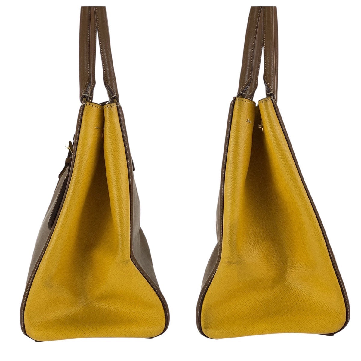 17047 PRADA プラダ サフィアーノ 三角ロゴプレート バイカラー ブラウン イエロー ゴールド金具 レザー トートバッグ ショルダーバッグ 2WAY レディース AB78