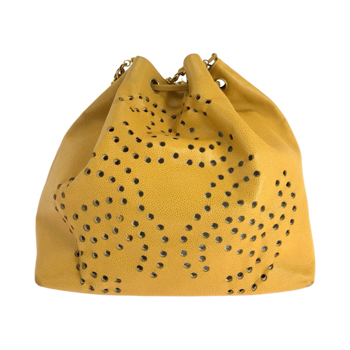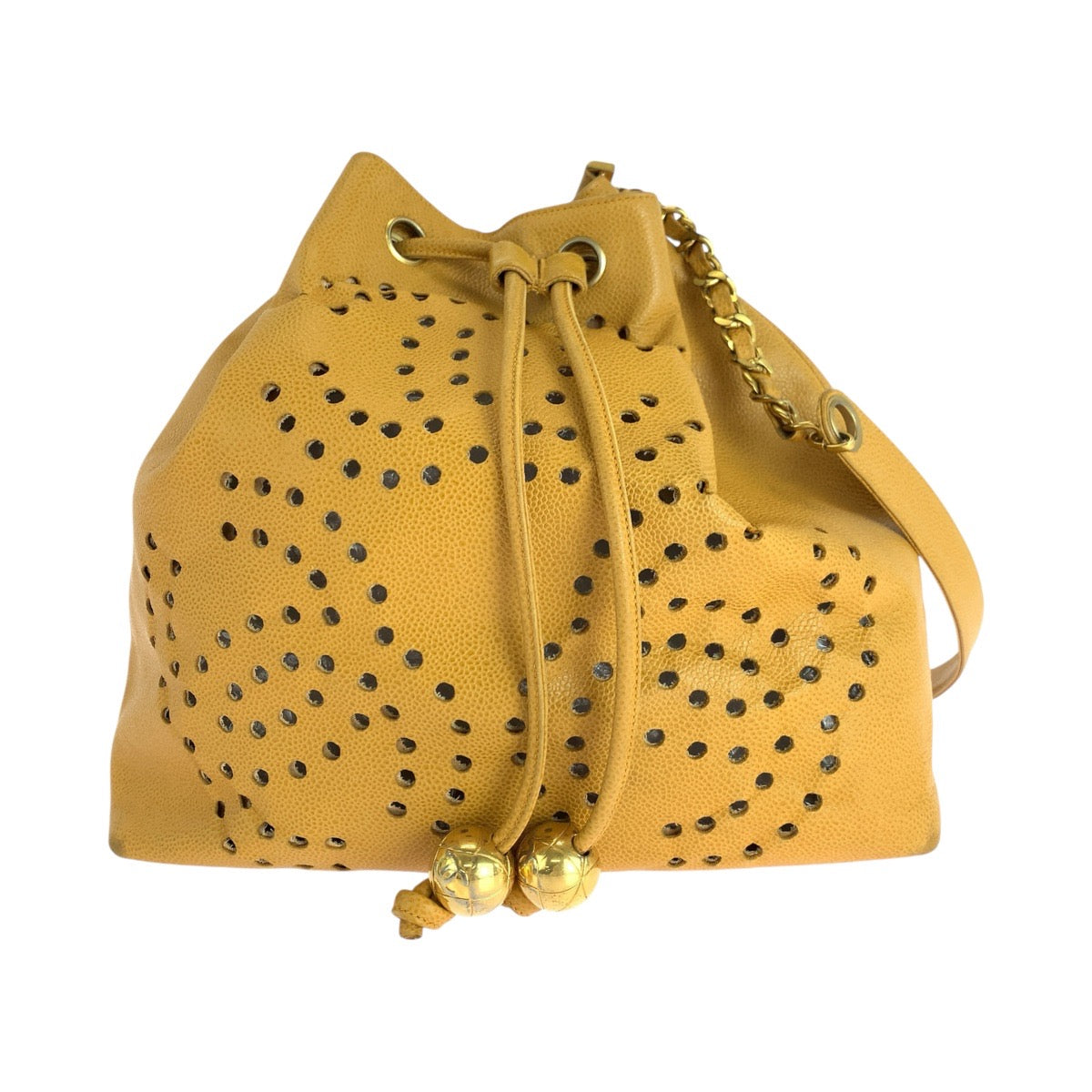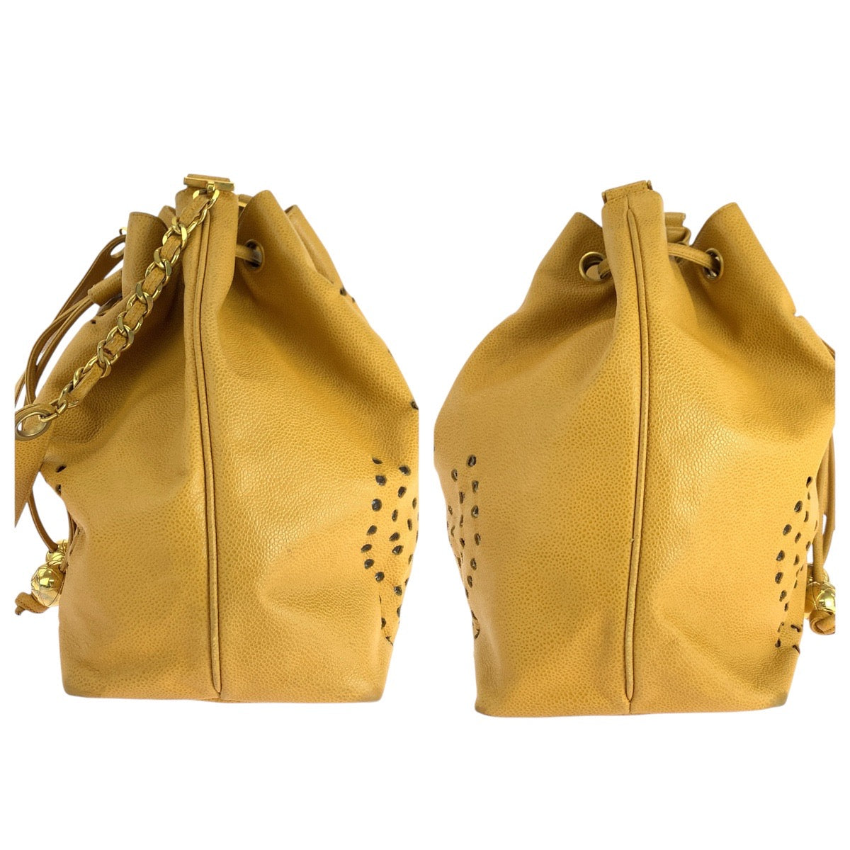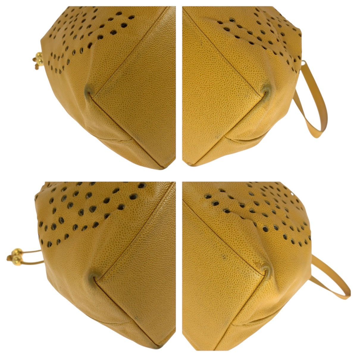 17873 CHANEL シャネル ヴィンテージ パンチング トリプルココマーク イエロー ゴールド金具 キャビアスキン 巾着 ショルダーバッグ レディース AB92