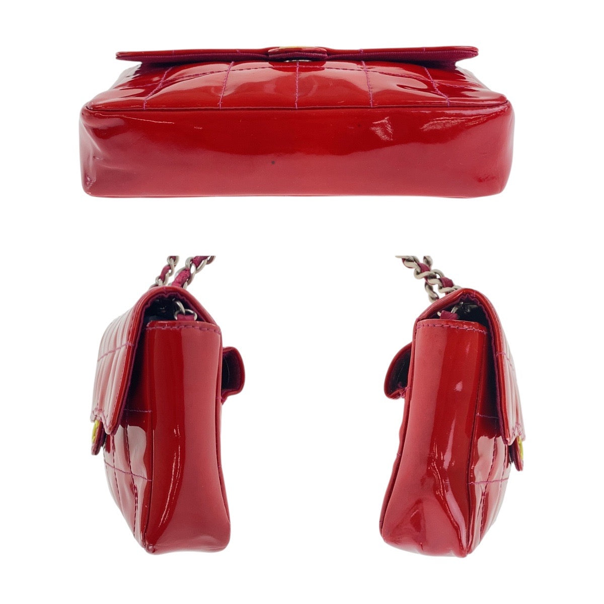 20020 CHANEL シャネル ヴィンテージ チョコバー ココマーク レッド イエロー シルバー金具 エナメル チェーンショルダーバッグ ウエストバッグ レディース AB100