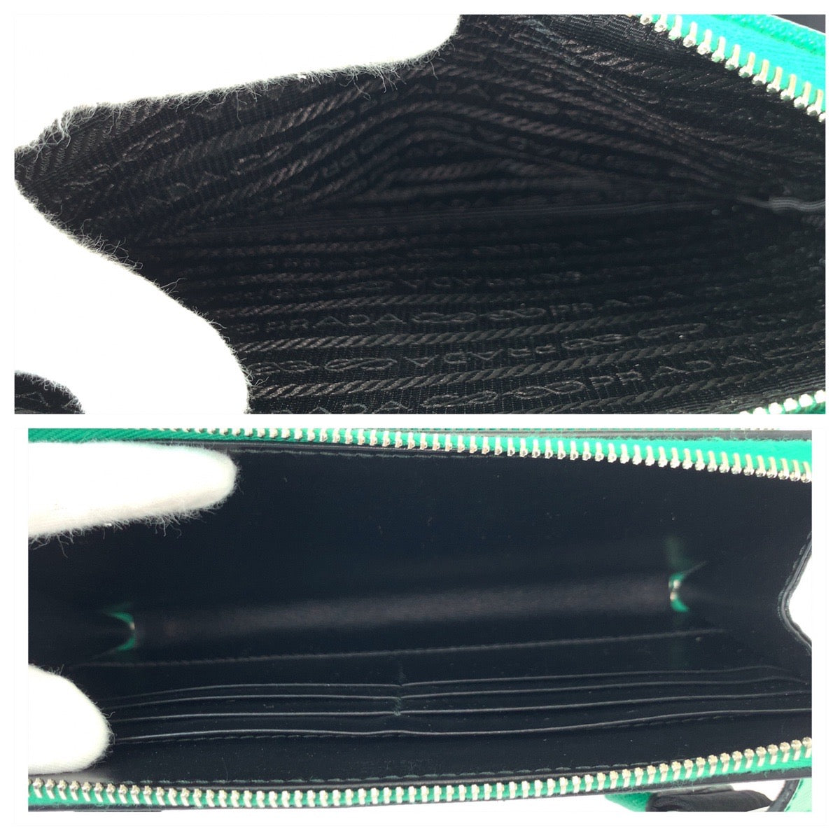 21954 PRADA プラダ サフィアーノ 三角ロゴプレート グリーン ブラック シルバー金具 レザー ボディバッグ ウエストバッグ バムバッグ レディース A10