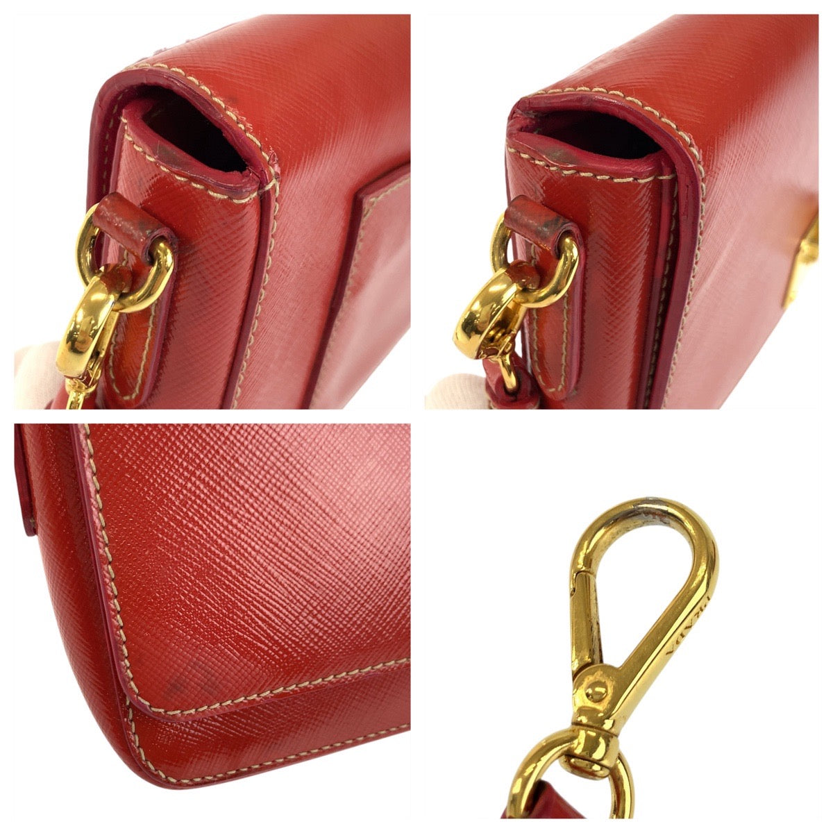 23123 PRADA プラダ サフィアーノ 三角ロゴプレート レッド ゴールド金具 レザー ショルダーバッグ ポシェット レディース AB20